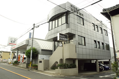 グレーの3階建ての事務所です。